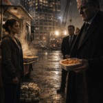 His steps slowed. His eyes took in details Tom had trained himself to blur: the coat too big for the woman’s thin frame, the shoes with holes, the cardboard sign with words he couldn’t quite read.