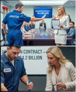 His blue janitor’s uniform looked almost loud against the ocean of tailored suits and polished watches. The air smelled like espresso, printer ink, and the kind of money that could buy silence in bulk. A pen hovered above a signature line that would move $4.2 billion from one set of hands to another.