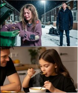 A little girl, no more than seven years old, was methodically searching through the garbage. Not flailing, not playing. Working. Her thin fingers, red and trembling from the cold, picked through empty food containers and crumpled paper with the practiced efficiency of someone who had done this before. Like it wasn’t shocking. Like it wasn’t wrong. Like it was simply Tuesday.