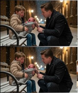 He wrapped his coat around both children. The expensive cashmere swallowed them, turning the boy into a bundled shadow and the baby into a lump of desperate warmth. Gabriel crouched until he was level with the kid.