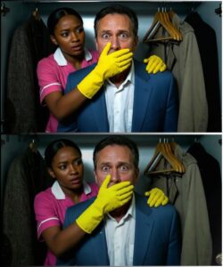 A strong hand seized his wrist and yanked him sideways, dragging him into the narrow darkness of a linen closet just as the hallway lights flickered on. The door shut inches from his face. Shelves rattled softly. Towels shifted. The air filled with the clean scent of lavender soap mixed with something sharper.