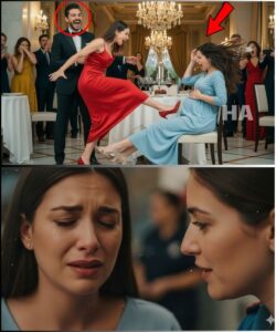 Her hip hit first, then her shoulder, then her back slammed down against the stone floor with a heavy crack that turned heads across the room. The chair collapsed onto its side. A wine glass tipped and shattered, fragments scattering like ice across the aisle. Cutlery clattered. Plates rattled.