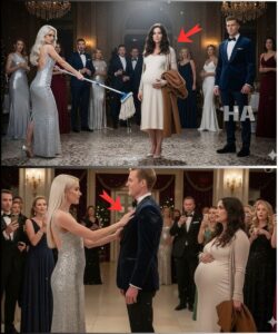 Six months pregnant, standing at the edge of the ballroom in a borrowed cream maternity dress, flat shoes, an old brown coat folded over my arm. No diamonds. No designer bag. No glam. I’d dressed like a woman you’d walk past in a grocery store aisle without noticing.