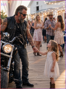 The music kept playing, but every conversation stopped. Every laugh died midair. Every glass paused halfway to someone’s mouth. Sixty bikers and their families turned toward the corner where a six-year-old girl held the hand of a blind giant who had not smiled in three years.