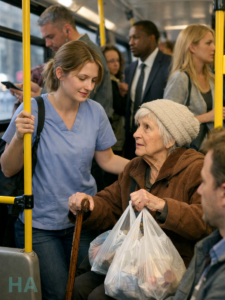She sat down slowly, kept one hand on my wrist with a grip that did not belong to someone her age, and leaned close enough for me to hear her over the rattle of the bus.